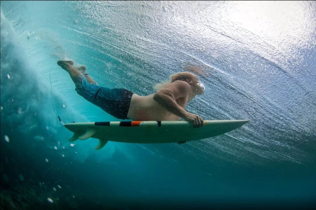 Duck Dive - 潜越。(一种潜入浪的动作,用手臂、膝部和脚的配合将板压入水里穿过浪。)